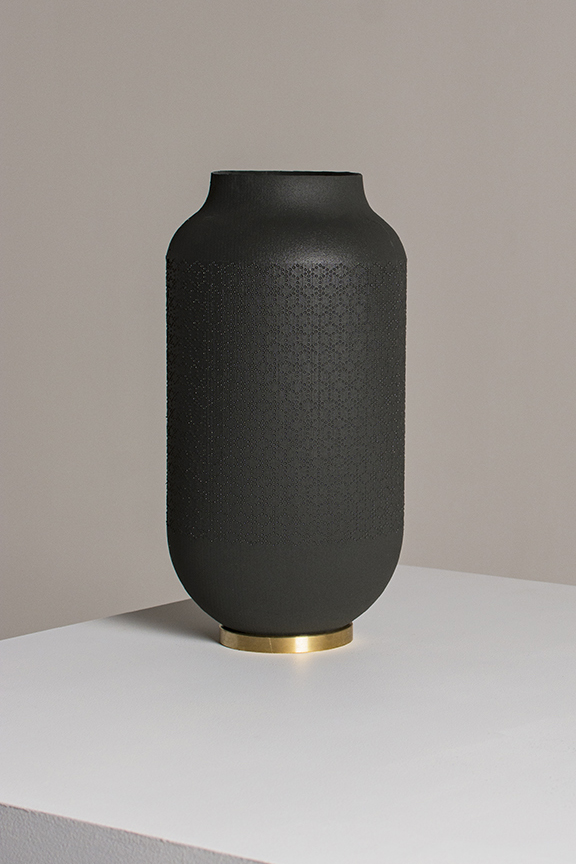 3d printed nylon, powder coated steel, brass, frosted acrylic, black wood